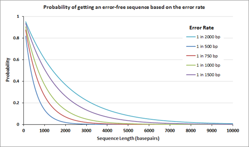 Error-rate is important in gene synthesis. Genes are now more frequently assembled using chemically synthesized, overlapping oligonucleotides. The overlapping oligonucleotides are ligated, extended, or 'filled' to create larger constructs or even genomes. Owing to mistakes in chemical synthesis and subsequent enzyme-based assembly processes, the assembled genes unavoidably contain errors. The average rate of the errors attributed to chemical synthesis typically range from 1 to 10 errors per kilobase pair of assembled DNA. The following graph on the left displays the theoretical probability of finding an error-free gene of different lengths at a given error rate.