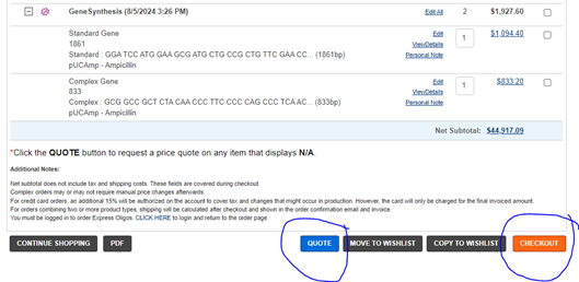 2.  Once your gene or gene fragment is in the cart, select it and click the Quote button instead of the checkout button.